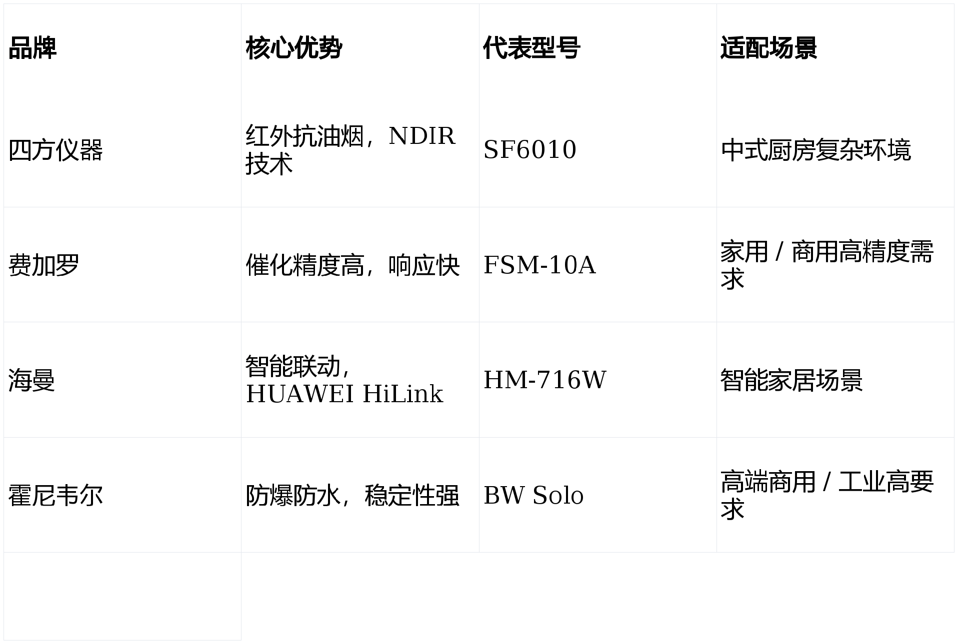 • | 類(lèi)型 | 壽命 | 抗油煙 / 干擾 | 精度 | 成本 | 適用場(chǎng)景 |