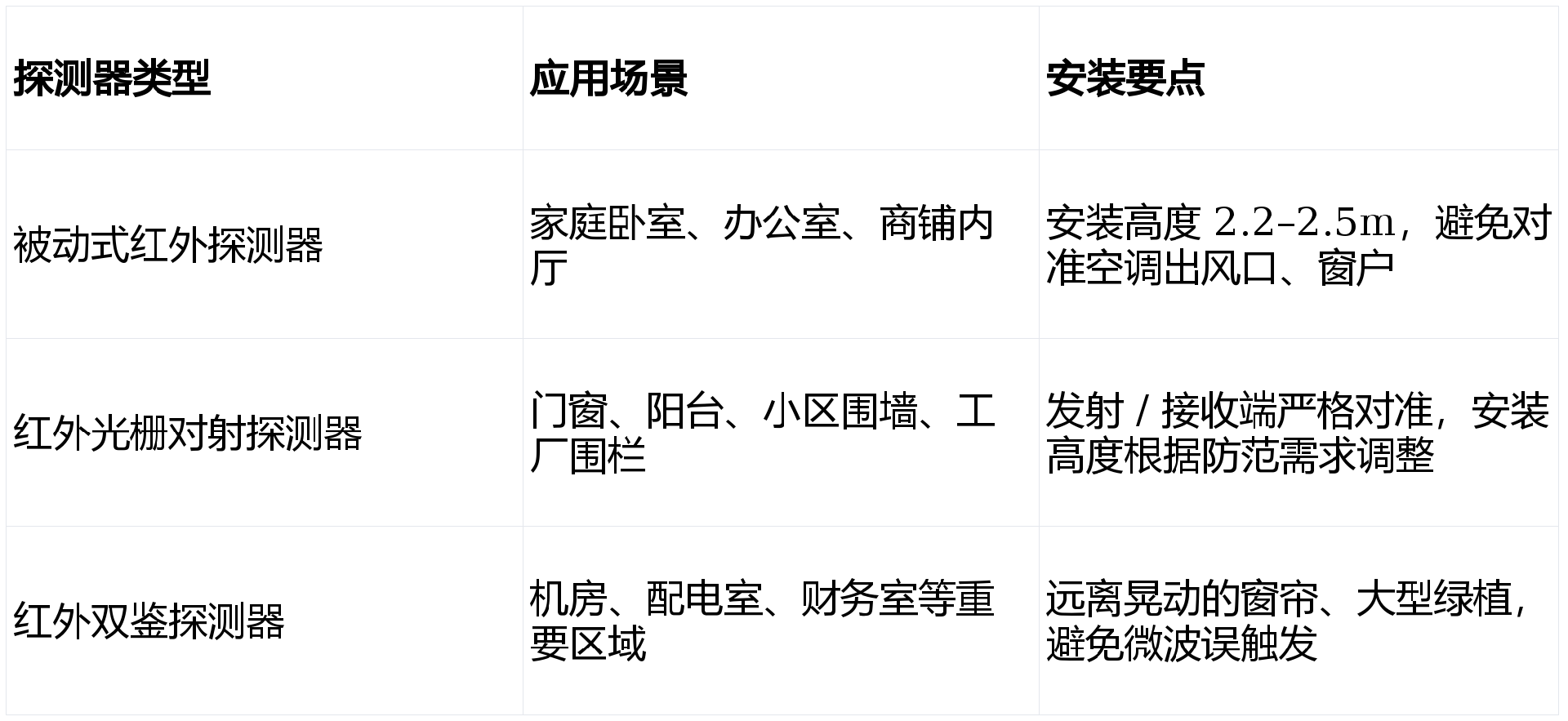 • 室內(nèi)被動式探測器:確保探測范圍覆蓋門窗、通道等入侵必經(jīng)之路,避免出現(xiàn)盲區(qū);